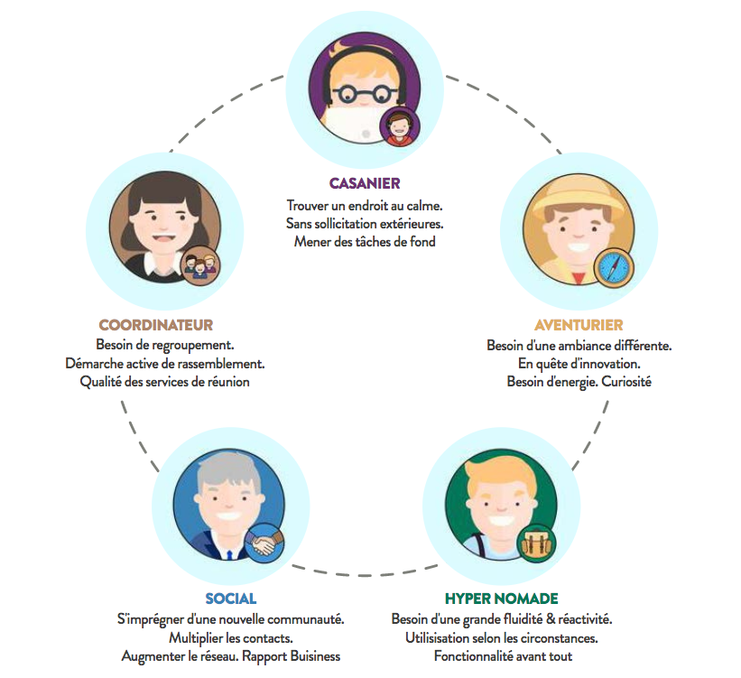 Mais attention à ne pas aller trop vite ; tout comme il y a plusieurs types de besoins et de motivations qui amènent les salariés à vouloir travailler dans un tiers-lieu, il y a plusieurs profils de coworkers nomades, comme l’ont développé Baptiste Broughton, Herveline Denis, Xavier de Mazenod, Nathanaël Mathieu et Frantz Gault dans leur livre blanc « Coworking, les nouveaux bureaux de l’entreprise » :